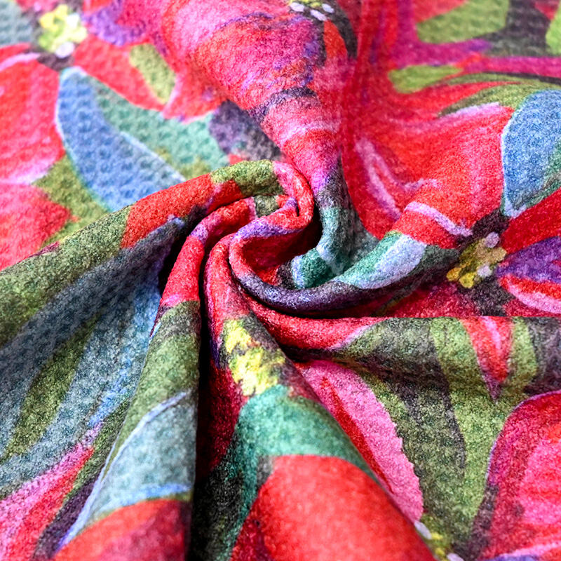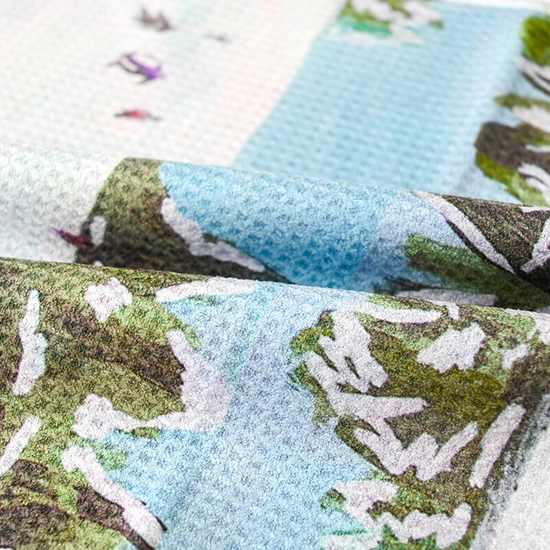 This reactive printed waffle microfiber towel is designed for kitchen cleaning and dining use. It combines waffle weaving with reactive printing, featuring beautiful patterns on one side and a plain color on the other. Made of high-quality microfiber, it offers fast water absorption and strong stain removal.
